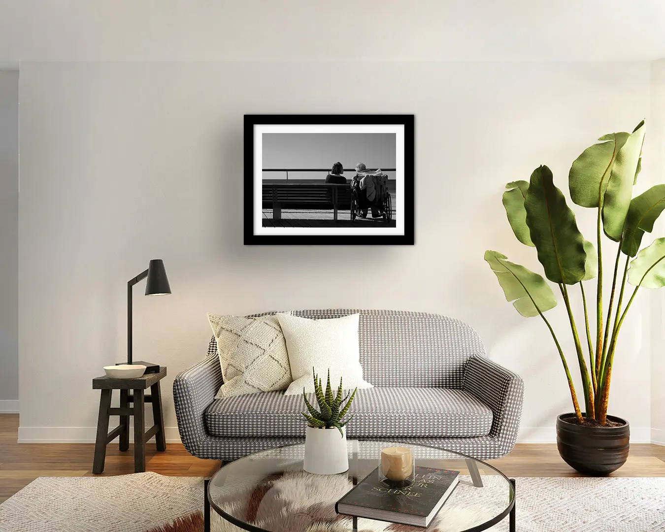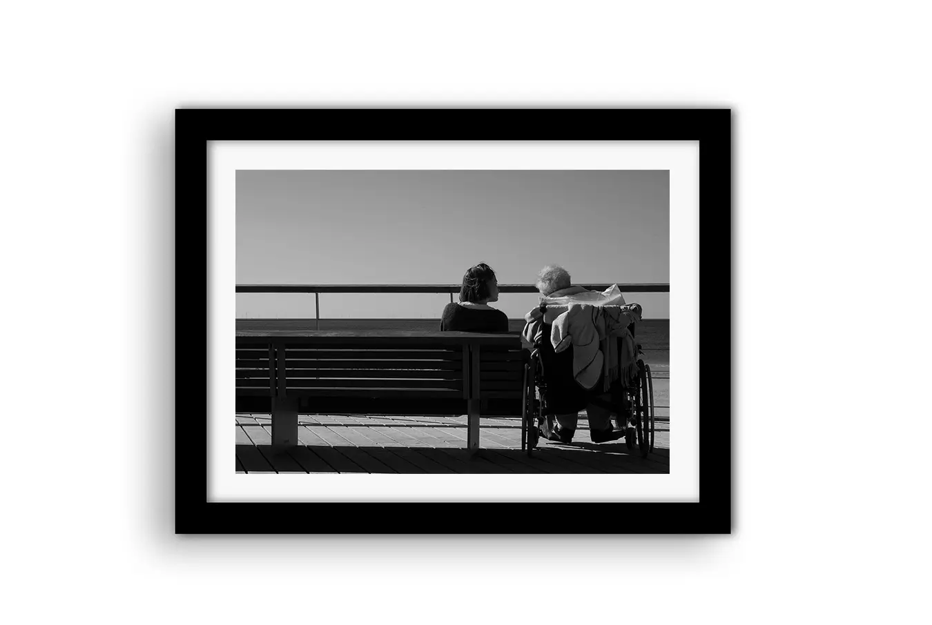 Une jeune fille et son arrière-grand-mère de 100 ans, côte à côte face à l’océan. Une image sobre et bouleversante. Tirage N&B sur papier mat 300g, dès 9 €.