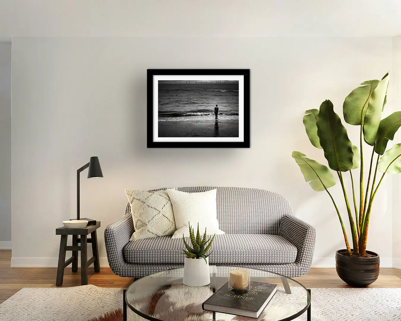 Tirage sur papier couché mat 300g, en quatre formats du 42 × 30 cm au 80 × 60 cm. Dans les grands formats, l’immensité de l’océan autour de la petite silhouette prend tout son sens.
