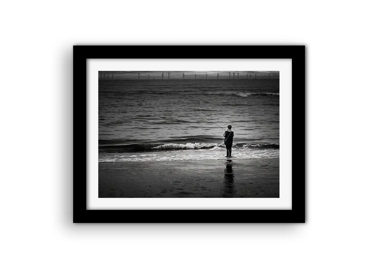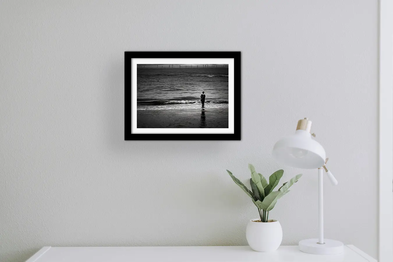 Un enfant seul au bord des vagues, sa canne à pêche tendue vers l’horizon. Une image rare et tranquille, hors du temps. Tirage N&B mat 300g, dès 9 €.