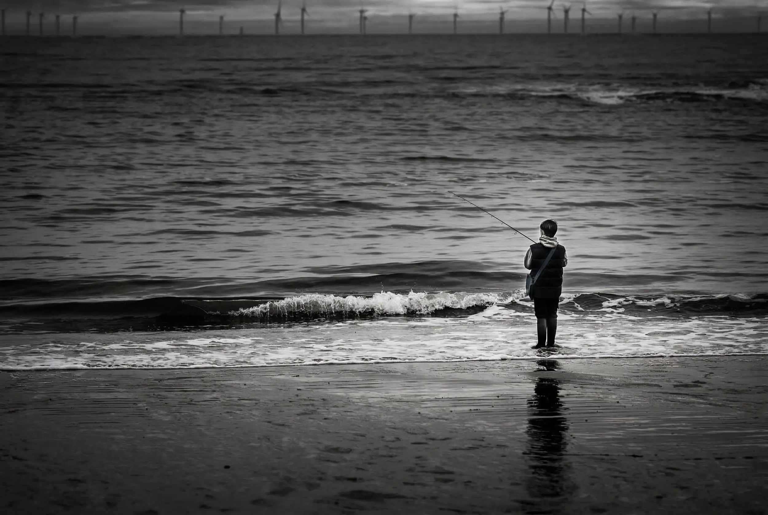 Enfin, peut-être — mais ce n’est pas pour ça qu’il est là, les pieds dans l’eau froide, la canne tendue vers une mer calme et grise. Il est là parce que cet endroit fait du bien. Parce que le bruit des vagues remplace avantageusement tout le reste. Parce qu’on peut rester longtemps à regarder l’horizon sans que personne vous demande pourquoi.