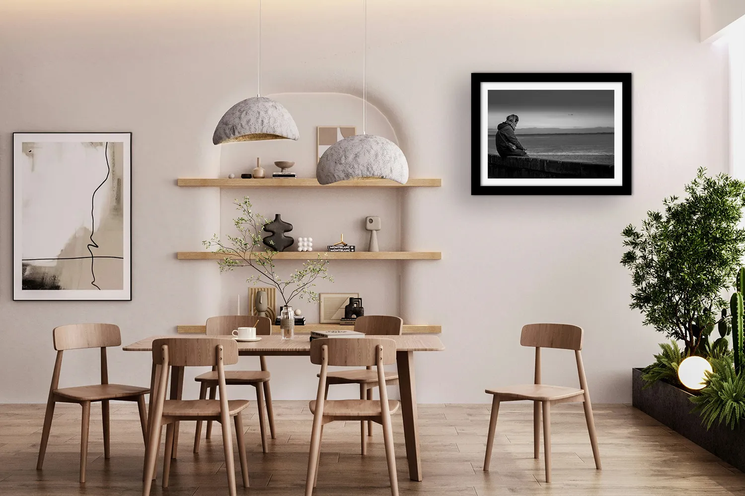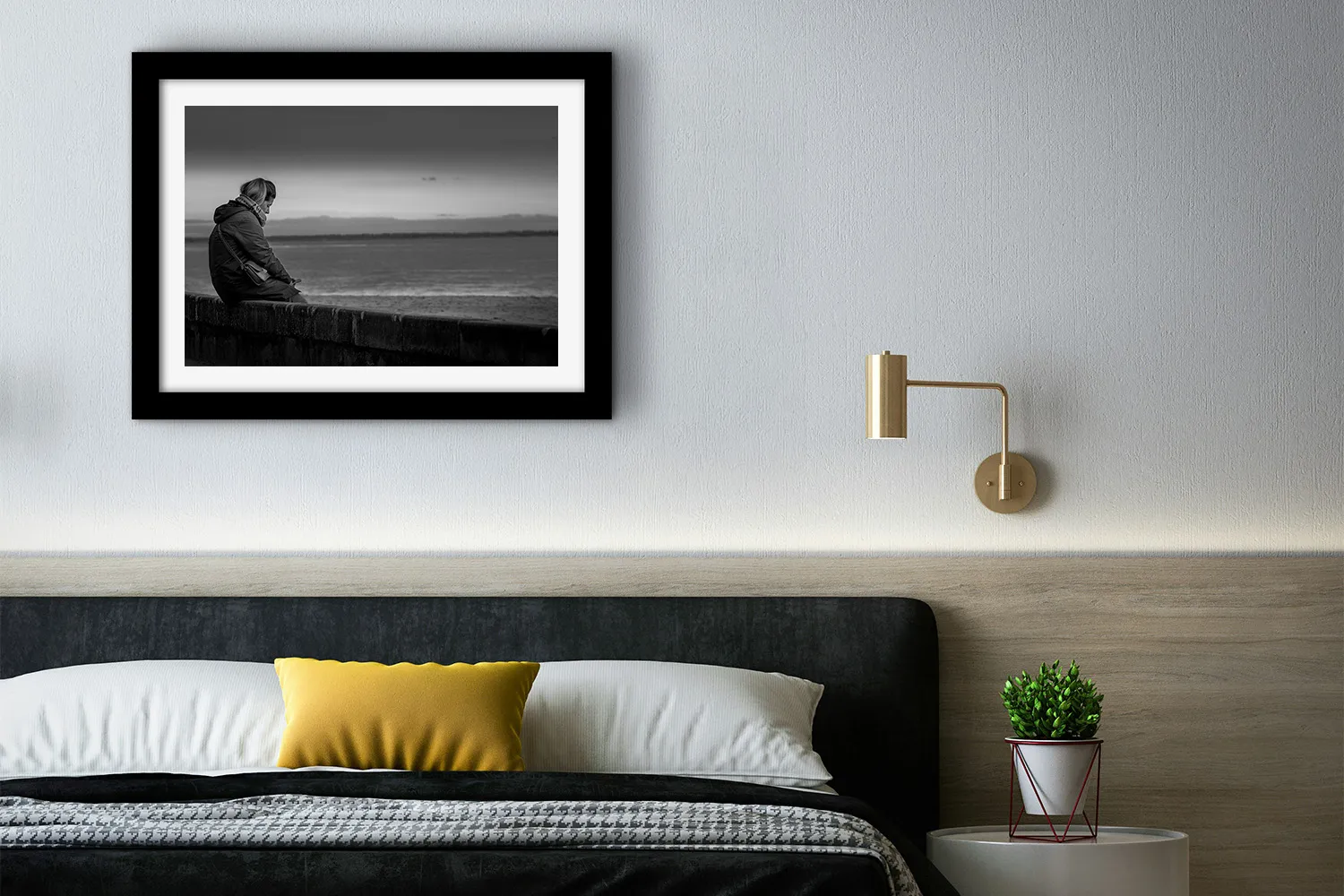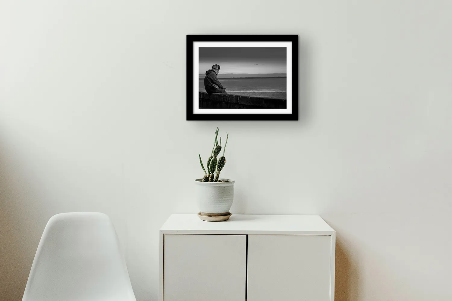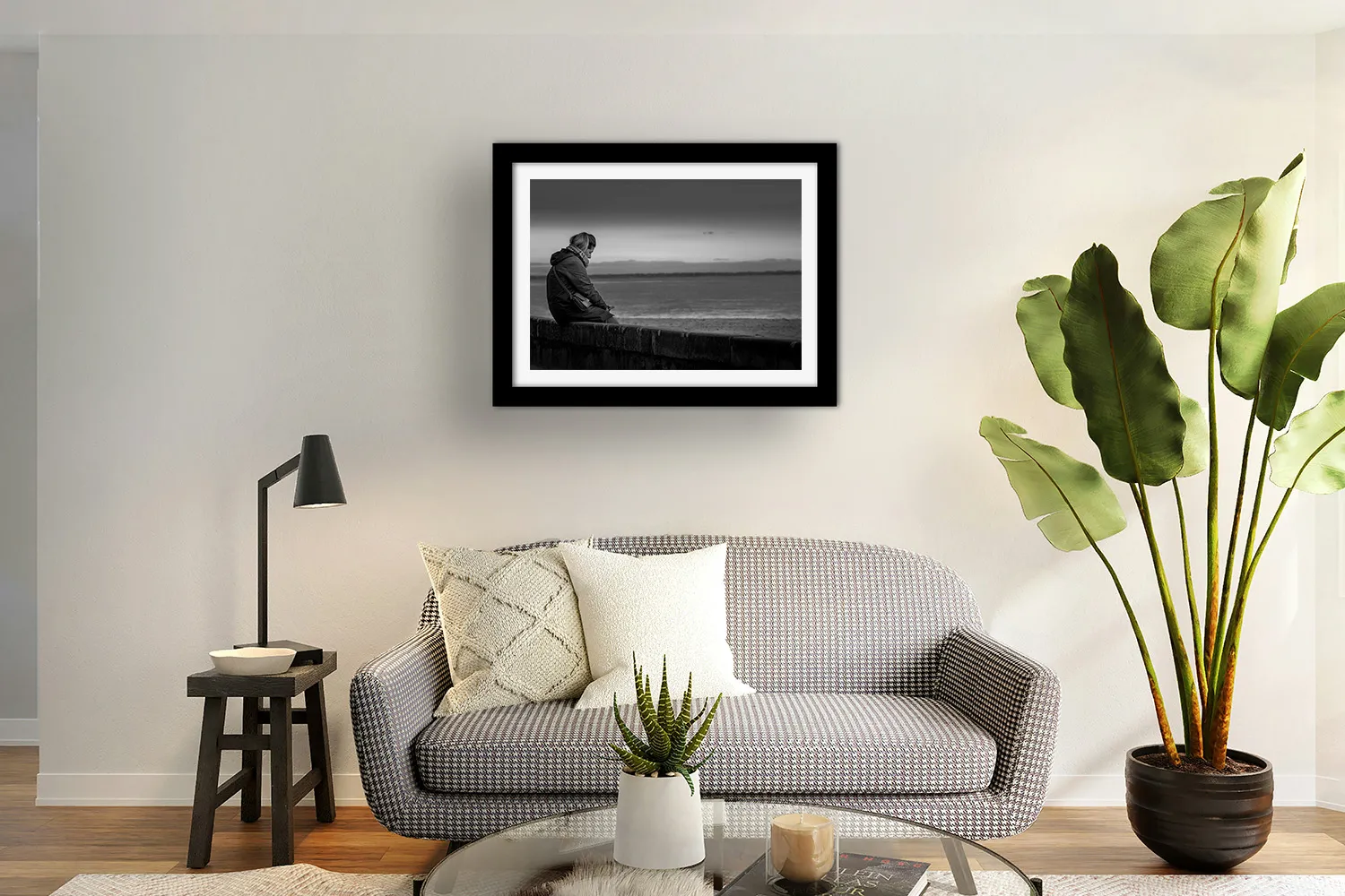Sur papier couché mat 300g, les nuances de gris de cette photo — du noir profond du manteau aux gris perle de l’océan et du ciel — s’expriment avec une grande finesse. Aucun reflet, une surface douce au regard. L’image tient dans le temps.
