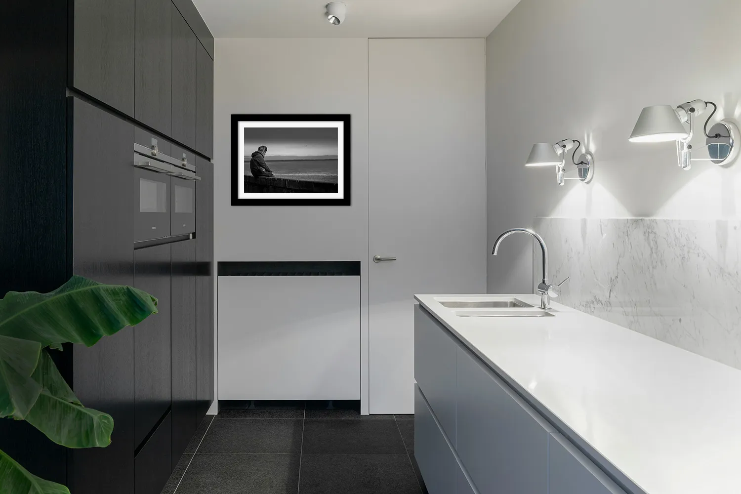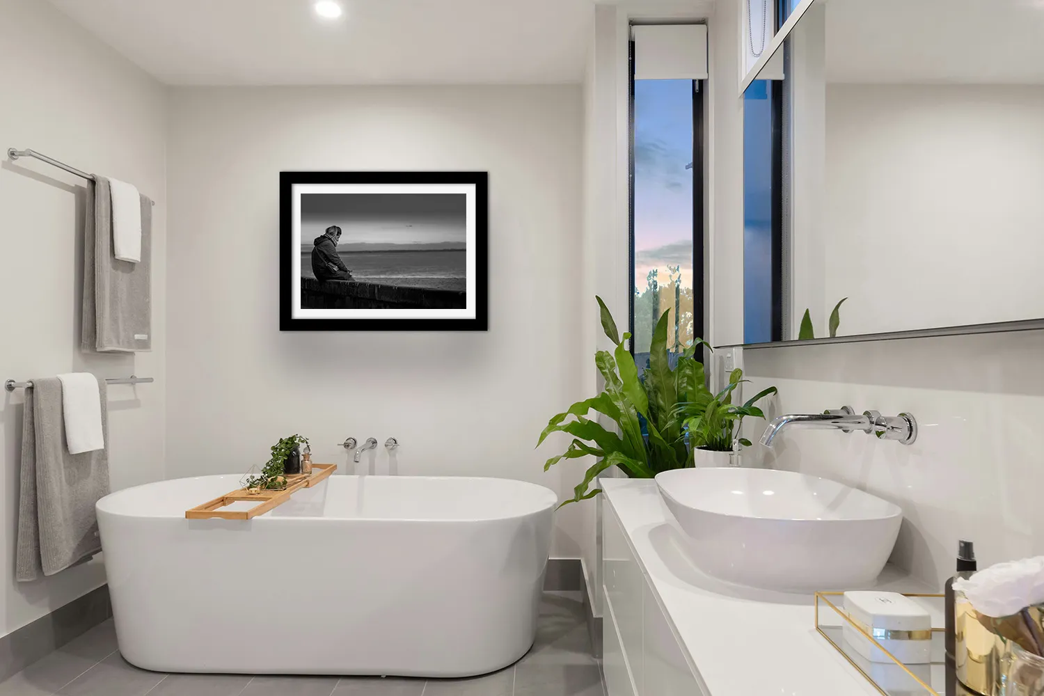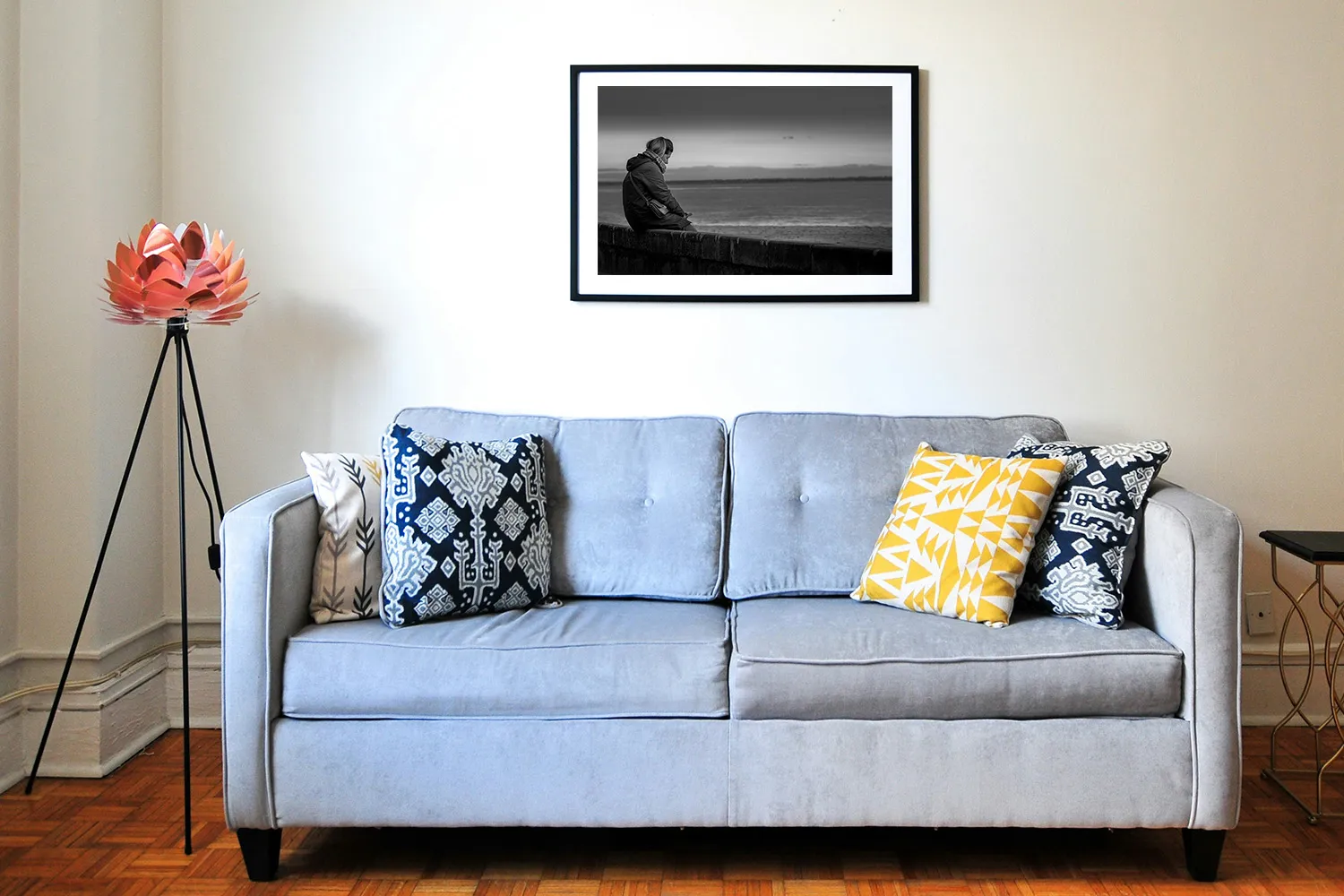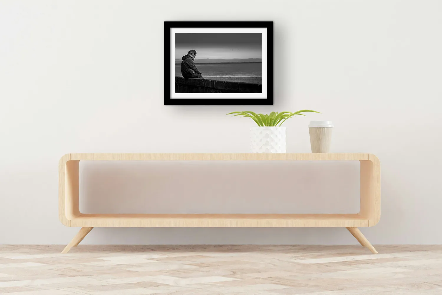 Sur papier couché mat 300g, les nuances de gris de cette photo — du noir profond du manteau aux gris perle de l’océan et du ciel — s’expriment avec une grande finesse. Aucun reflet, une surface douce au regard. L’image tient dans le temps.