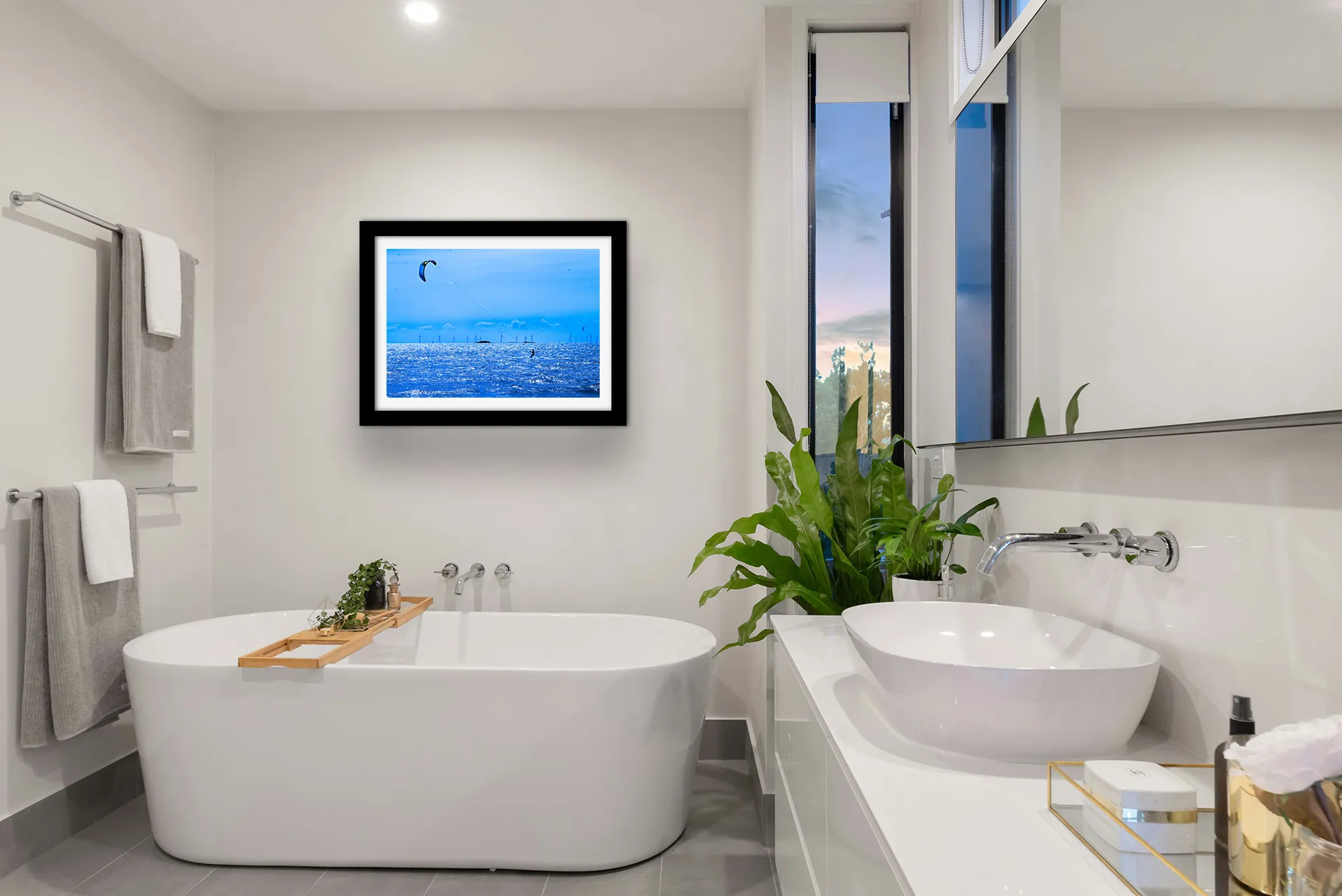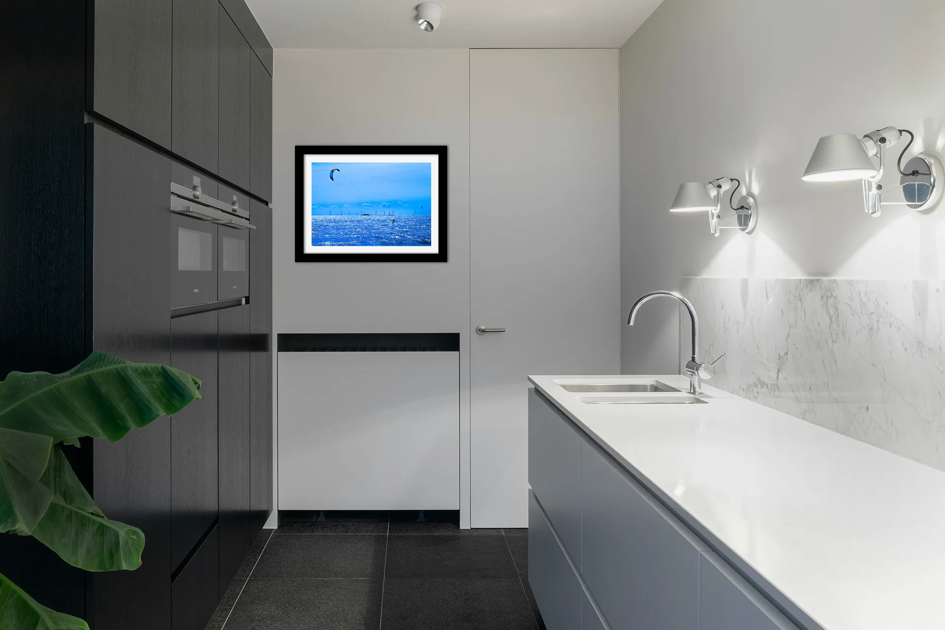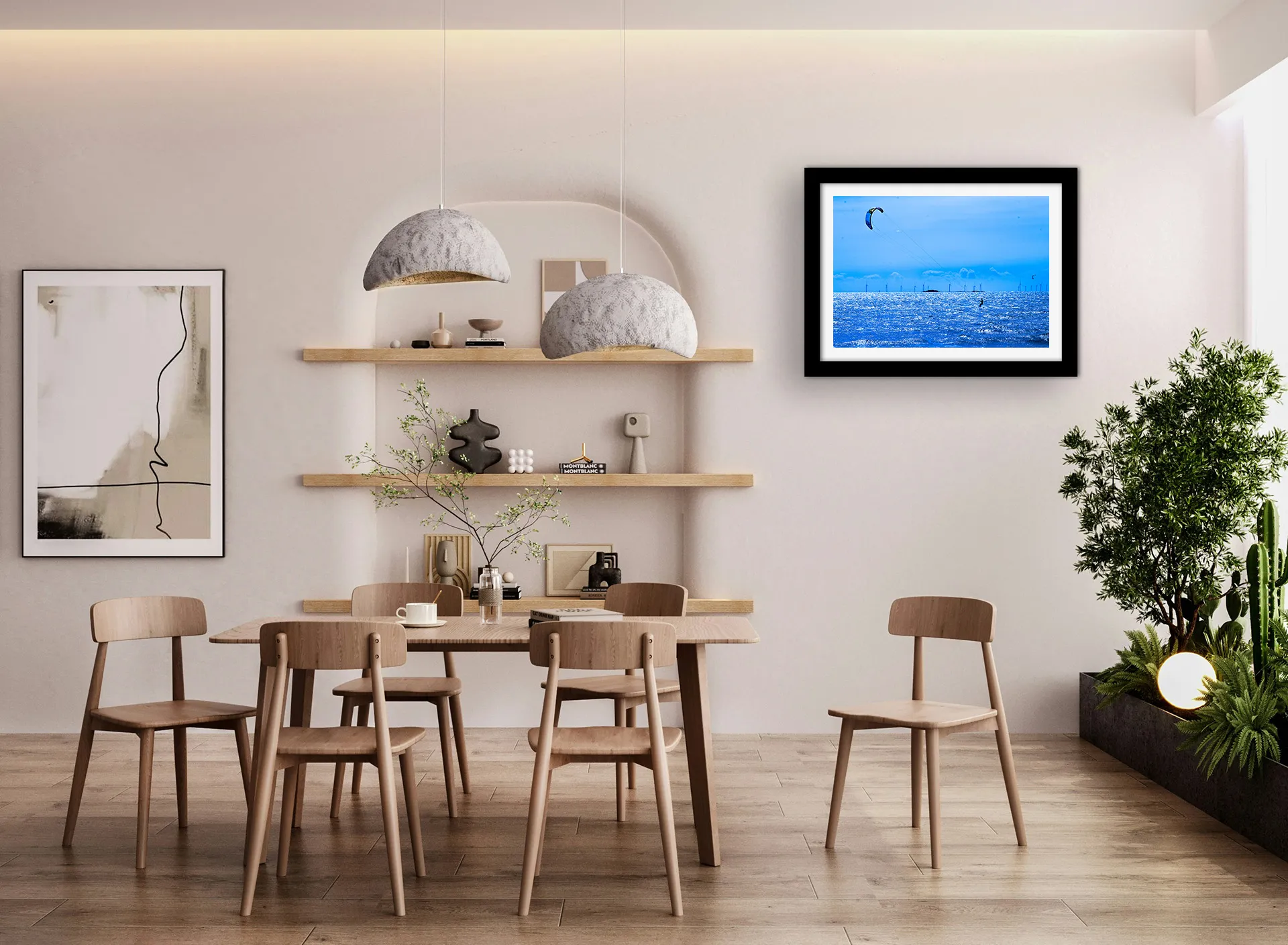 Chez vous, cette photo s’imposera naturellement dans un couloir, au-dessus d’un canapé, ou dans une chambre qui manquait d’air. Le bleu dominant est de ceux qui agrandissent l’espace et reposent le regard. Pas un bleu froid — un bleu de mer en plein jour, vivant, lumineux, chargé d’embruns imaginaires.