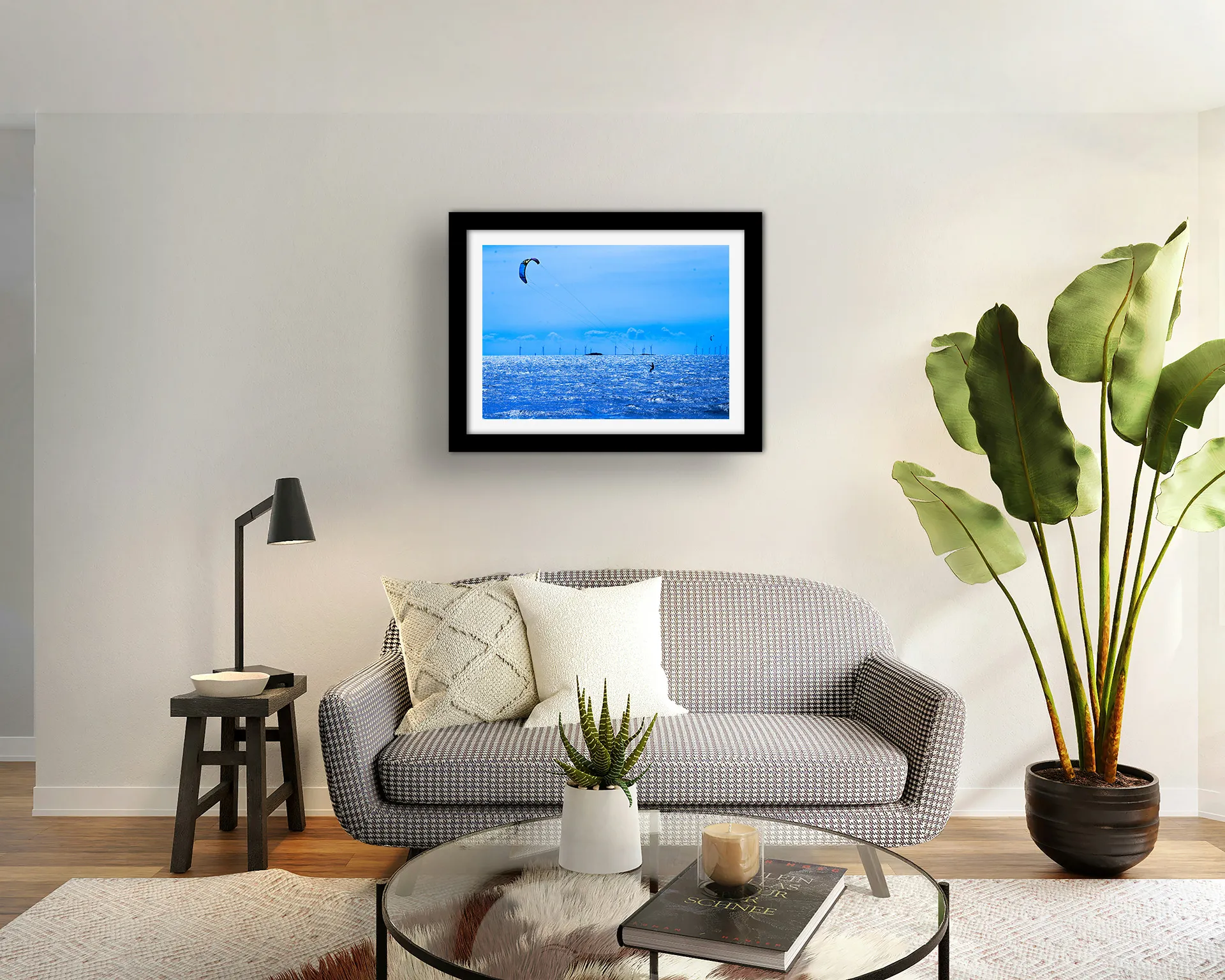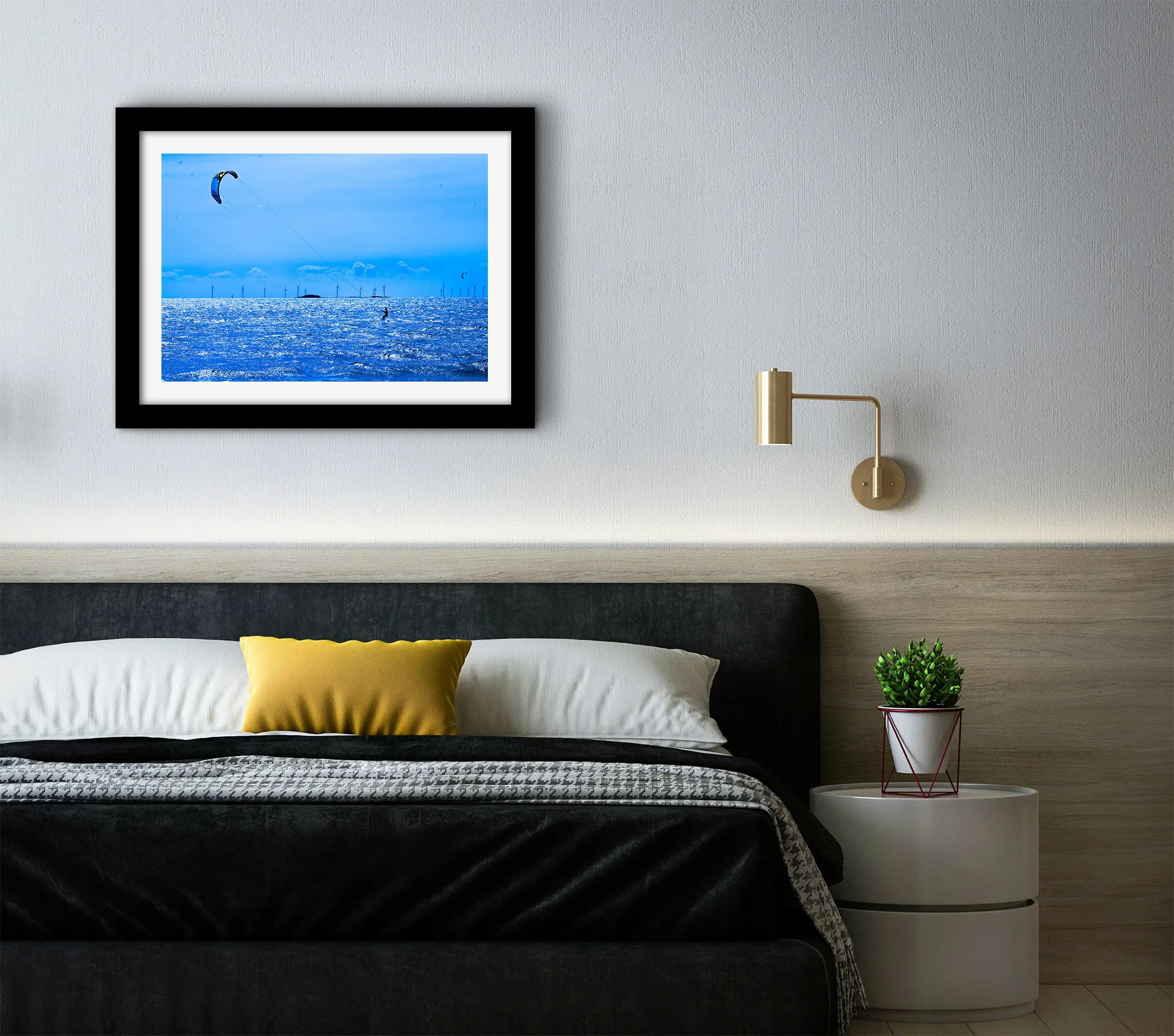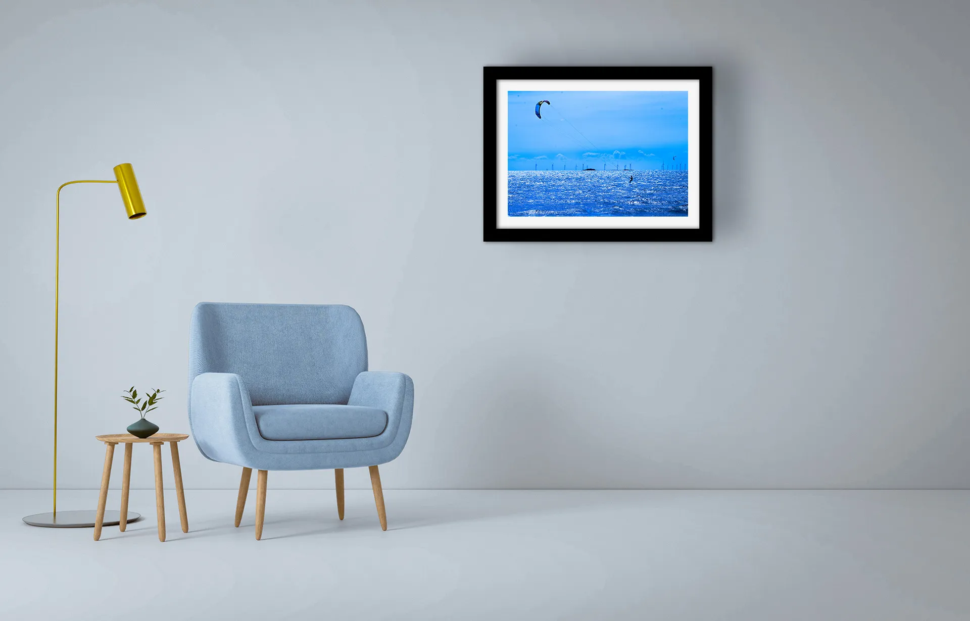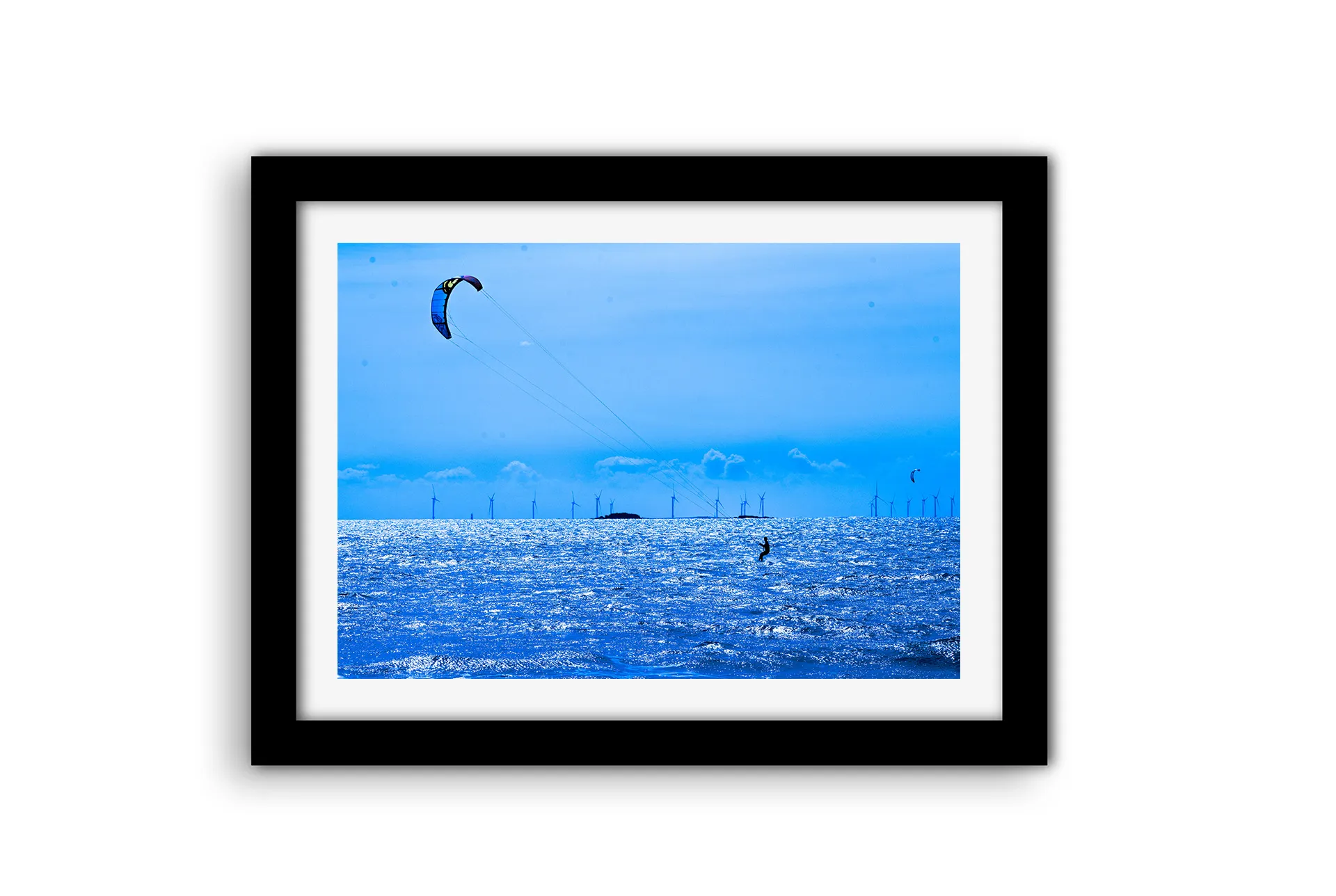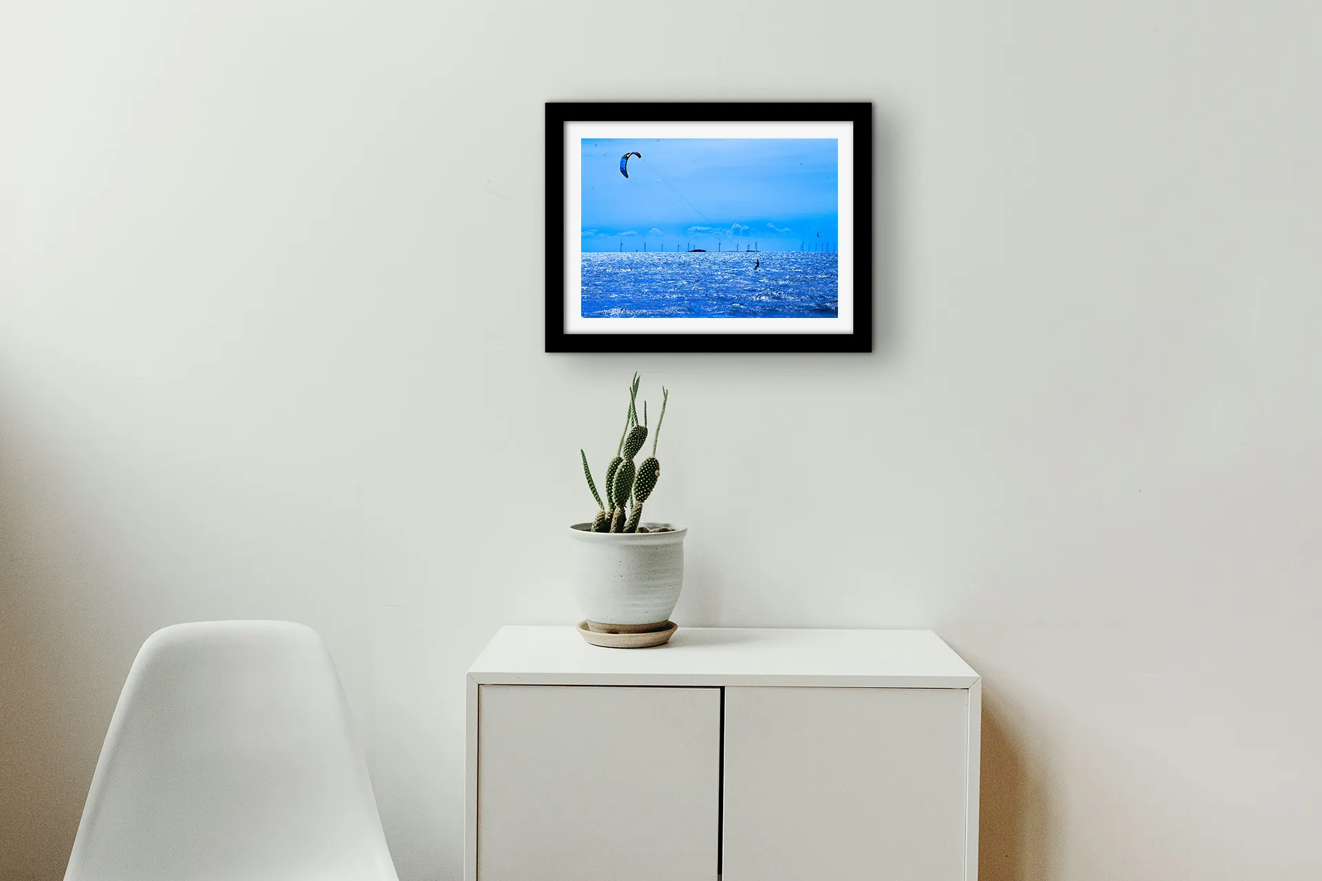 Un kitesurfer seul face à l’immensité. Photo de glisse prise à Pornichet, tout en nuances de bleu et de lumière. Imprimée sur papier mat 300g, dès 9 €.