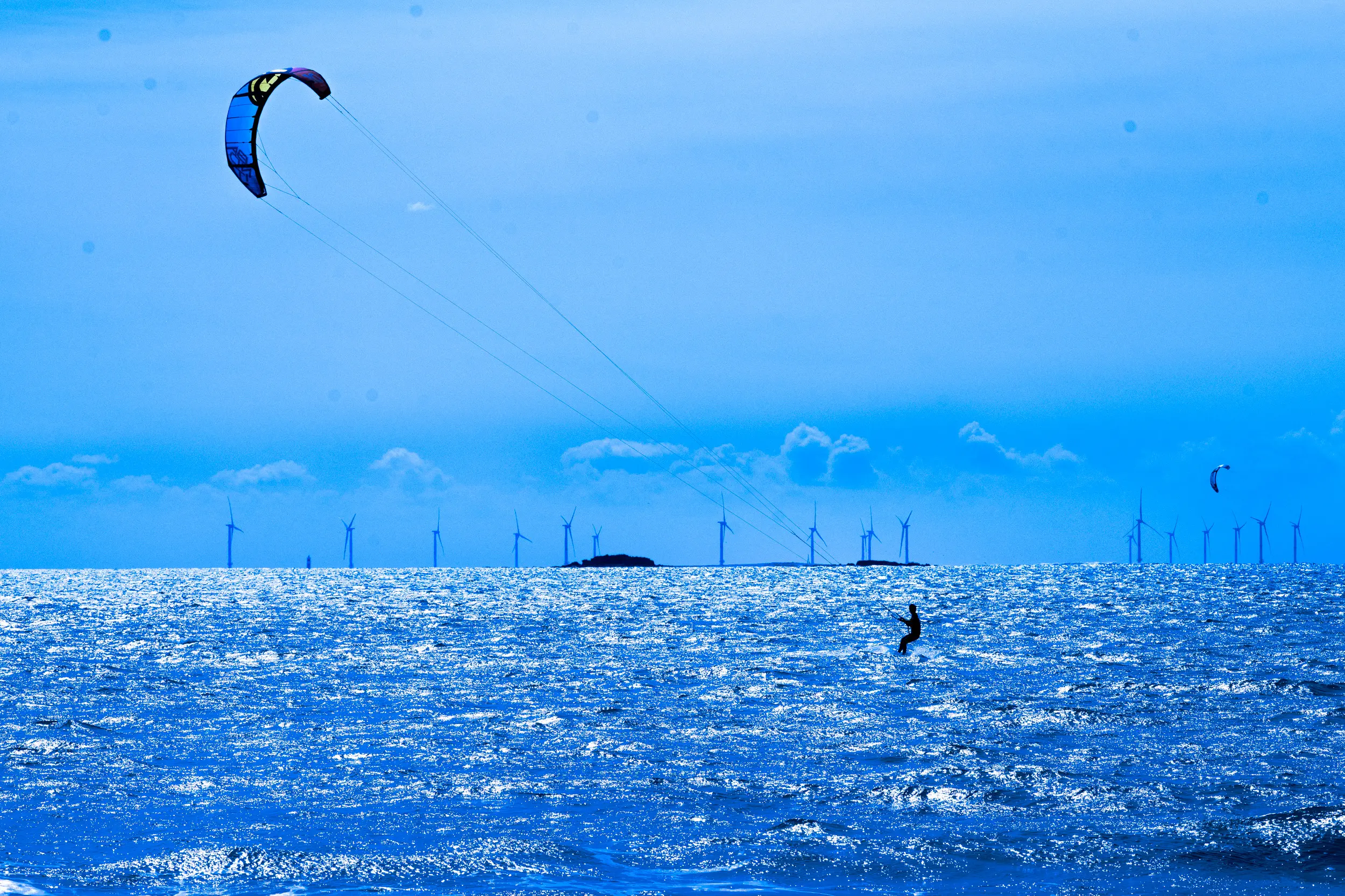 C’est ce paradoxe qui rend cette photo si particulière. On voit un homme libre, en mouvement, maître de quelque chose d’immense. Et pourtant, l’image est calme. Les bleus sont profonds, presque apaisants. Le cerf-volant dessine une courbe souple dans le ciel. À l’horizon, les éoliennes se fondent dans la brume marine comme un décor de rêve. Tout respire — même ce qui va vite.