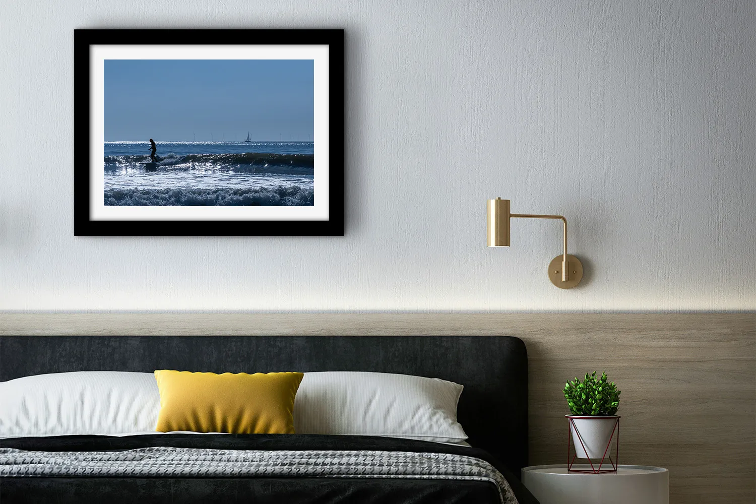 Silhouette en paddle dans les vagues à Pornichet, voilier et éoliennes à l’horizon. Photo glisse lumineuse, tirée sur papier mat 300g. Dès 9 €.